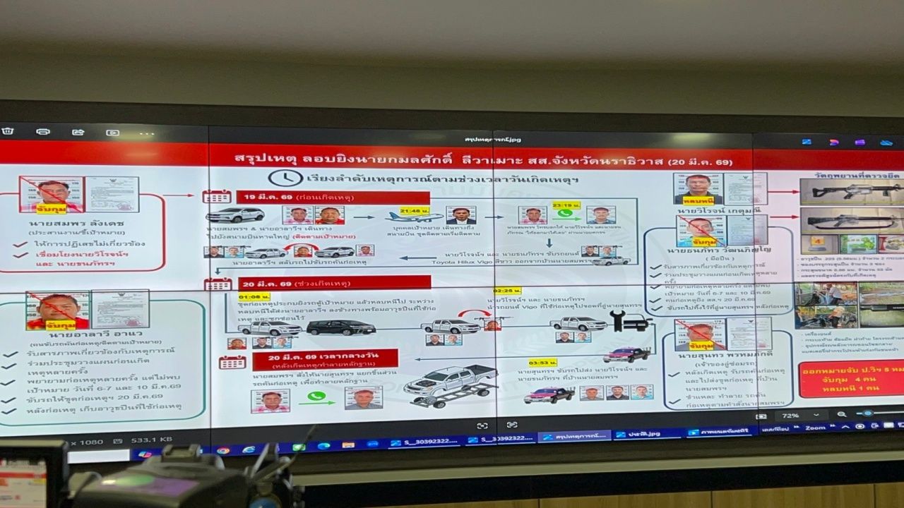 ก่อนหน้านี้ ตำรวจจับผู้ต้องหาได้แล้ว 4 ราย ได้แก่ นายสมพร ลังเดช (ประสานงานและชี้เป้า), นายอาลาวี อาแว (คนขับรถ), นายสุนทร พรหมภักดี (เจ้าของอู่รถ), และนายธนภัทร วัฒนภิญโญ (มือปืนอีกคน) โดยจับได้ในพื้นที่กรุงเทพฯ และกาญจนบุรี