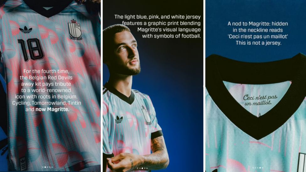 ชุดเยือนเบลเยียมได้แรงบันดาลใจจากเรเน มากริตต์ ศิลปินเซอร์เรียลลิสต์ แคมเปญคัดเลือกของปีศาจแดงแปลกประหลาด ชนะลิกเตนสไตน์ 6-0 แต่เสมอมาซิโดเนียเหนือ