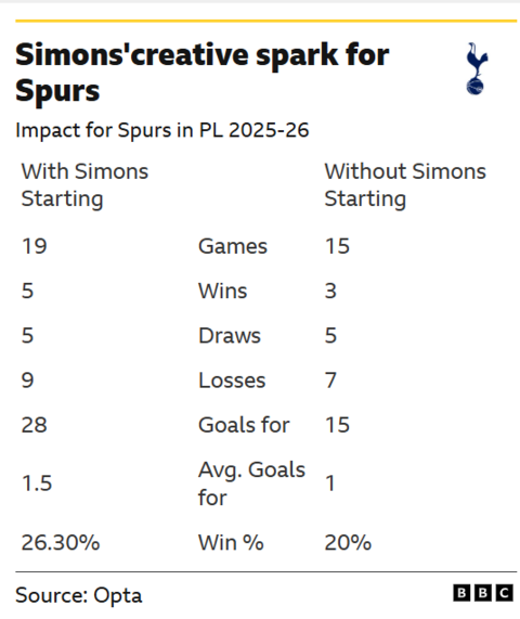 สถิติยืนยันช่องว่างที่เขาทิ้งไว้ สเปอร์สชนะบ่อยกว่าเมื่อเขาตัวจริง และยิงเฉลี่ย 1.5 ประตูต่อนัด เทียบกับ 1 ประตูเมื่อไม่มีเขา ในนัดเสมอบрайท์ตัน 2-2 และชนะวูล์ฟส์ 1-0 เขาสร้างโอกาส 4 ครั้งมากสุด ยิง 6 ครั้ง นำทีมสัมผัสบอลในกรอบ แครี่บอล และ پاسสำเร็จ