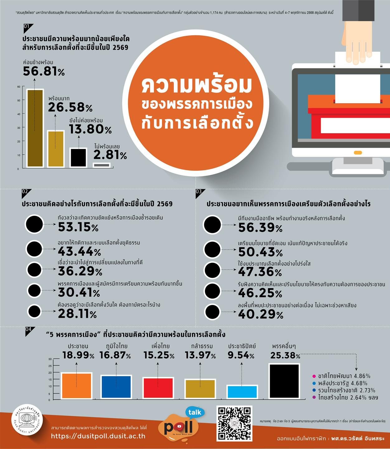 วันที่ 9 พฤศจิกายน 2568 สวนดุสิตโพล มหาวิทยาลัยสวนดุสิต สำรวจความคิดเห็นประชาชนทั่วประเทศ เรื่อง “ความพร้อมของพรรคการเมืองกับการเลือกตั้ง” กลุ่มตัวอย่างจำนวน 1,174 คน (สำรวจทางออนไลน์และภาคสนาม) ระหว่างวันที่ 4-7 พฤศจิกายน 2568 สรุปผลได้ดังนี้