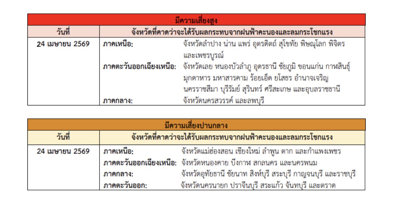 จังหวัดที่ได้รับผลกระทบวันที่ 24 เมษายน 2569