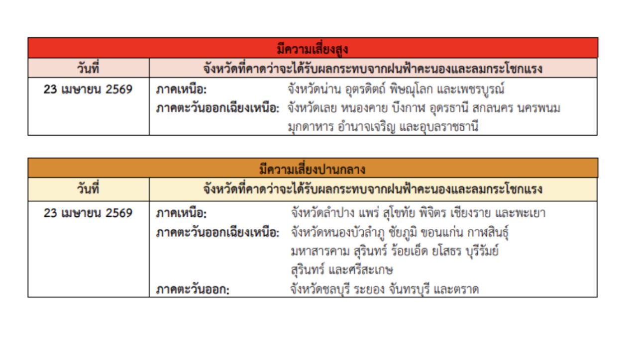 รายชื่อจังหวัดที่ได้รับผลกระทบวันที่ 23 เมษายน 2569