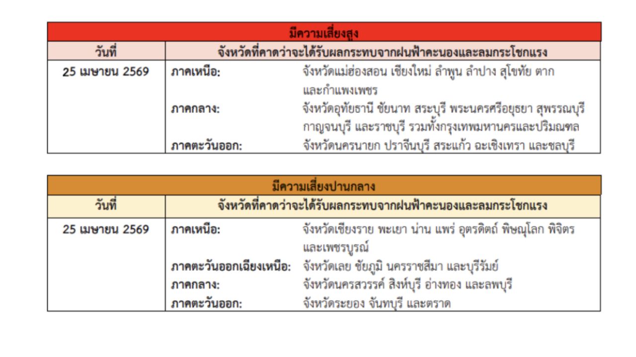 จังหวัดที่ได้รับผลกระทบวันที่ 25 เมษายน 2569