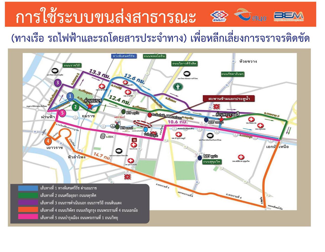 นายสุรพงษ์ จากสนข. แนะนำใช้ขนส่งสาธารณะเพื่อลดรถบนถนน เช่น เรือโดยสารคลองแสนแสบ ท่าประตูน้ำ สะดวกสุด รถไฟฟ้า Airport Rail Link สถานีราชปรารภ BTS ชิดลมหรือราชเทวี รถเมล์ ขสมก. และเอกชน สายต่างๆ เข้าสู่ใจกลางเมืองได้ง่าย ลดภาระจราจรได้เยอะ