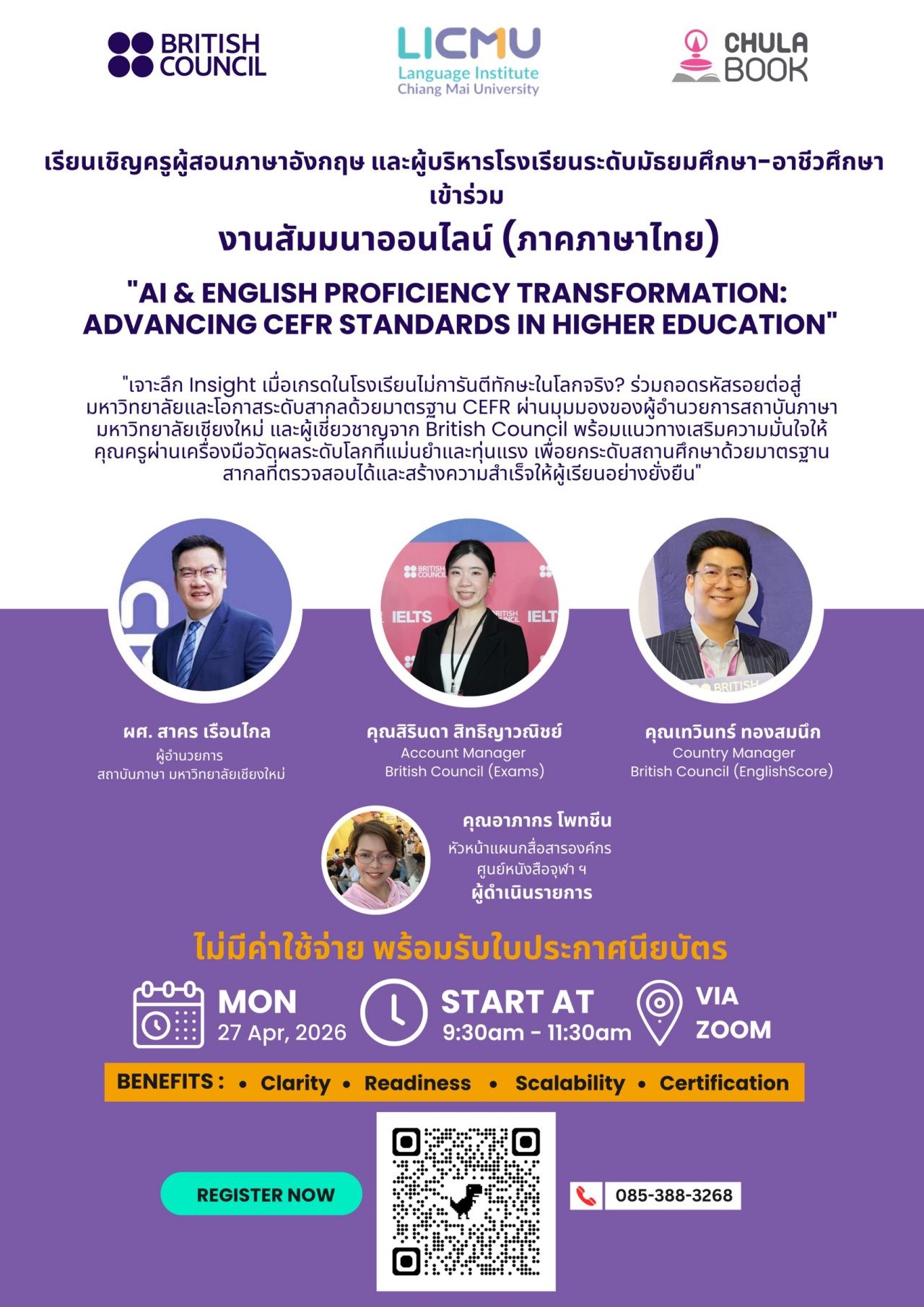 ศูนย์หนังสือจุฬาฯ ร่วมมือกับสถาบันภาษามหาวิทยาลัยเชียงใหม่ และ British Council Thailand จัดสัมมนาออนไลน์ฟรี หัวข้อ “AI & English Proficiency Transformation: Advancing CEFR Standards in Higher Education” ในวันจันทร์ที่ 27 เมษายน 2569 เวลา 9.30-11.30 น. ผ่าน Zoom เหมาะสำหรับครูผู้สอนภาษาอังกฤษและผู้บริหารสถานศึกษาที่ต้องการยกระดับคุณภาพการเรียนการสอนสู่มาตรฐาน CEFR ที่ตรวจสอบได้จริง
