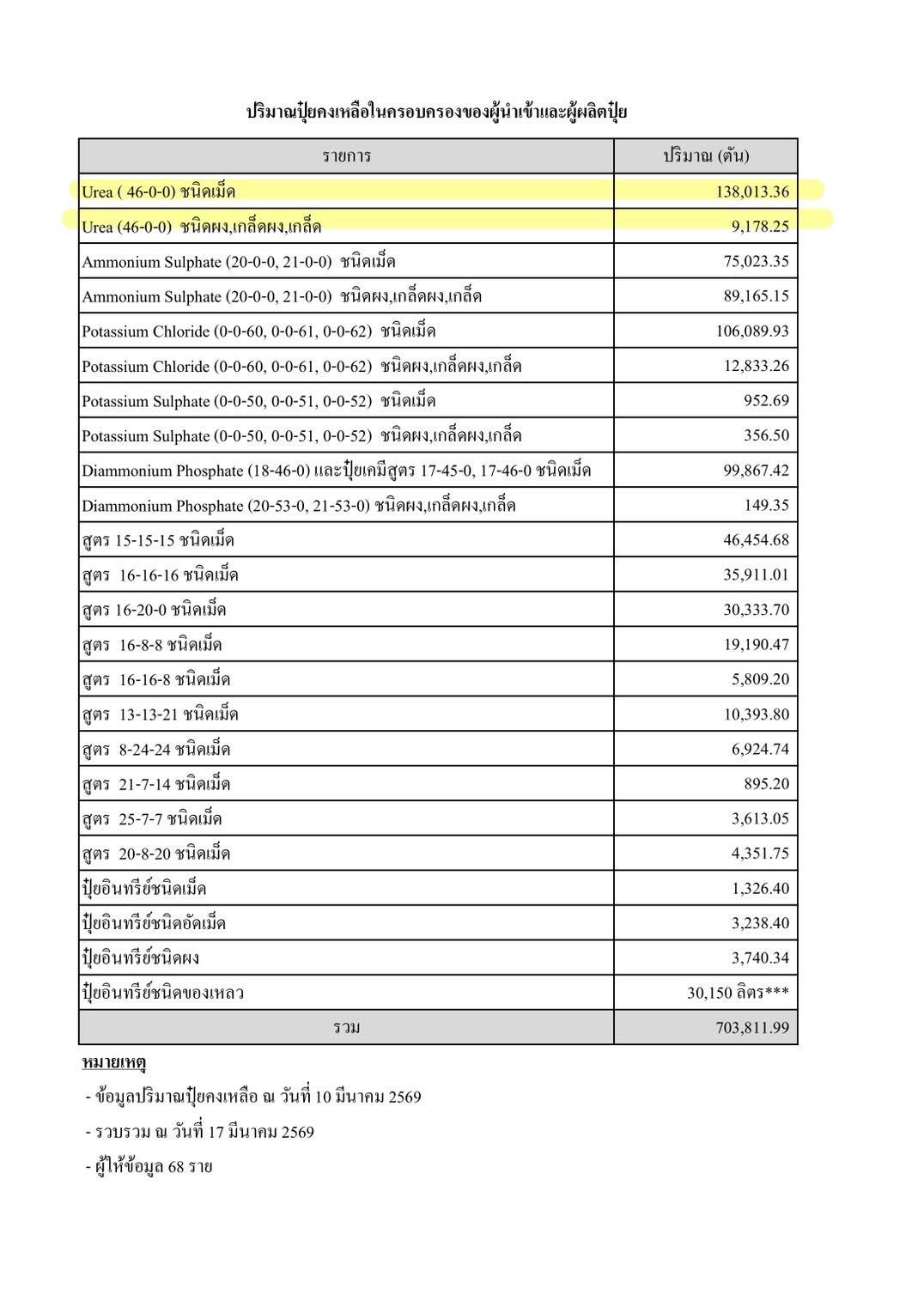 ข้อมูลปริมาณปุ๋ยยูเรียที่เหลือน้อยน่าตกใจ