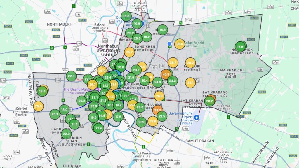 - เขตคลองเตย: 29.9 ไมโครกรัม/ลูกบาศก์เมตร