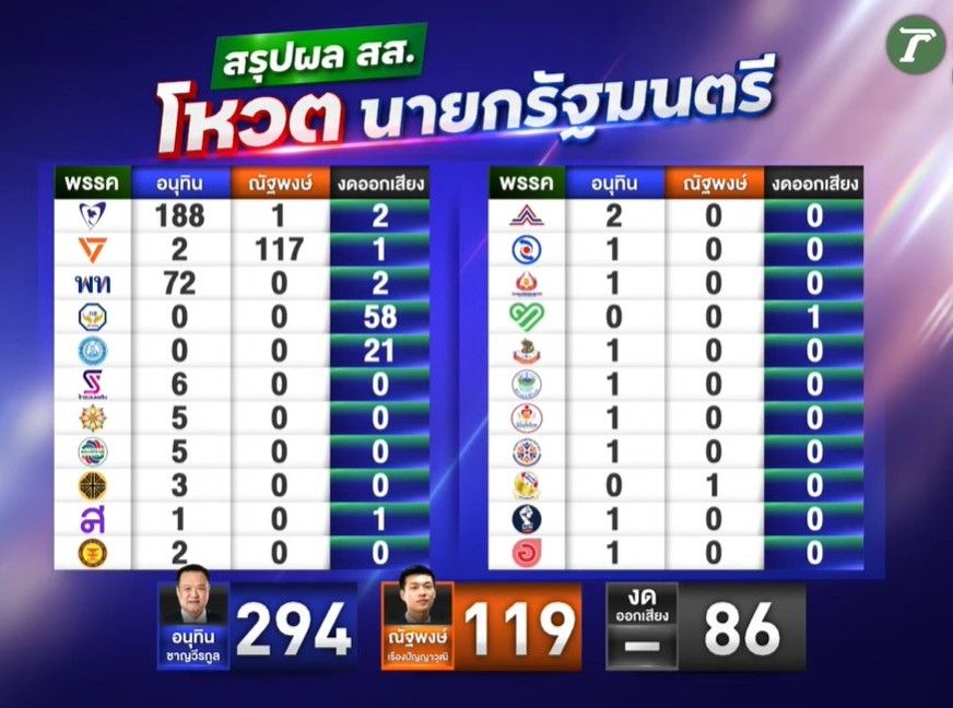 ที่มา – “อนุทิน”เสียงท่วมท้น 293 คะแนน นั่งเก้าอี้นายกฯ งูเห่าพรรคส้ม อุดรธานี เขต7 โผล่โหวตหนุน