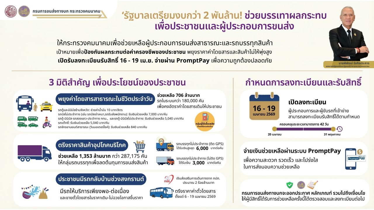 - รถทัวร์ บขส. และรถร่วมบริการ: อุดหนุนส่วนต่างค่าโดยสารช่วงสงกรานต์ 6-19 เม.ย. เพื่อให้ประชาชนเดินทางราคาเดิม สบายใจกลับบ้าน