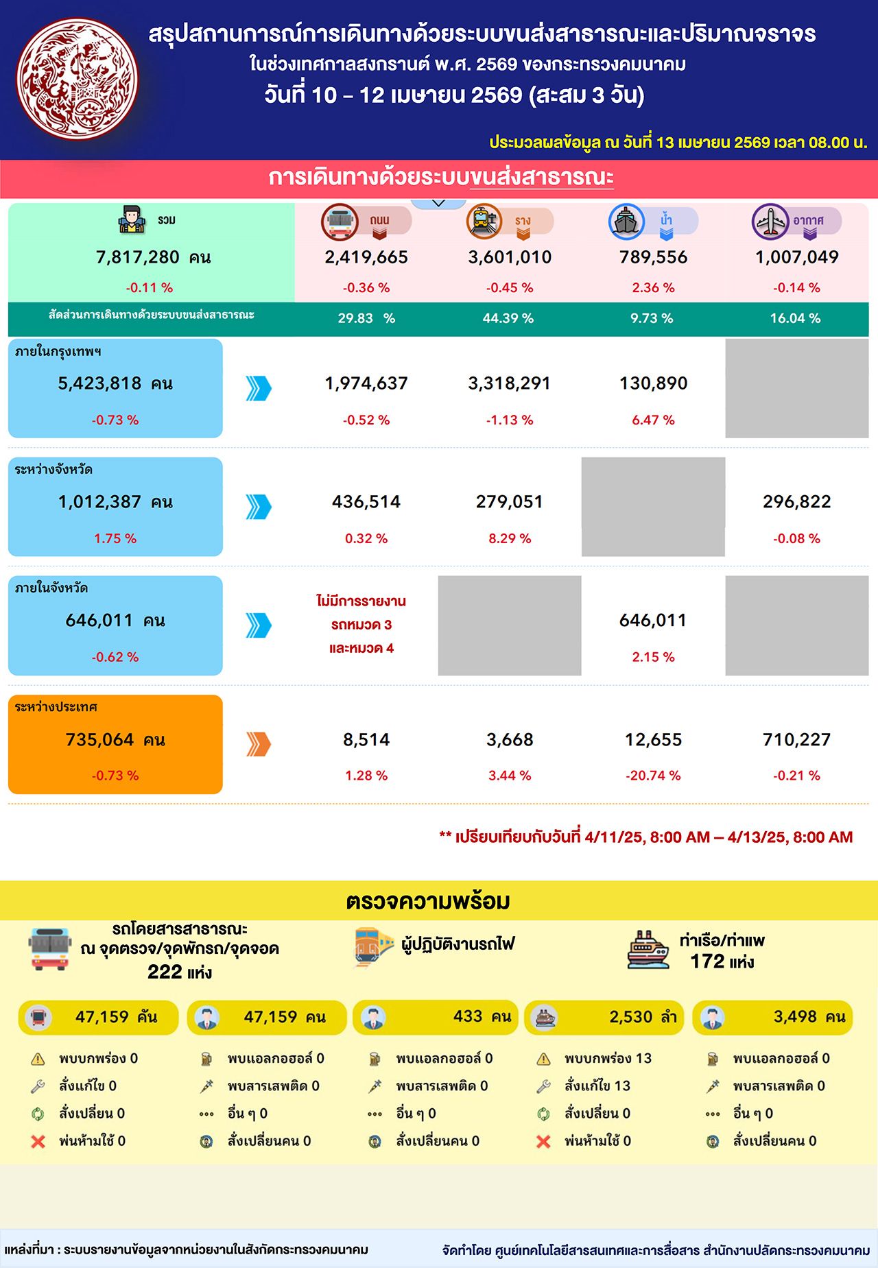 จากข้อมูลของศูนย์ปฏิบัติการความปลอดภัยคมนาคม หรือ ศปภ.คค. กระทรวงคมนาคม ช่วงวันที่ 10-12 เมษายน 2569 ซึ่งเป็น 3 วันแรกของเทศกาลสงกรานต์ พบว่าประชาชนเดินทางด้วยขนส่งสาธารณะรวมทั้งหมด 7,817,280 คน โห เยอะมาก! ระบบขนส่งรองรับได้ดี ไม่มีใครตกค้างเลยครับ โดยระบบรางครองแชมป์ส่วนแบ่งสูงสุด 44% เลยทีเดียว