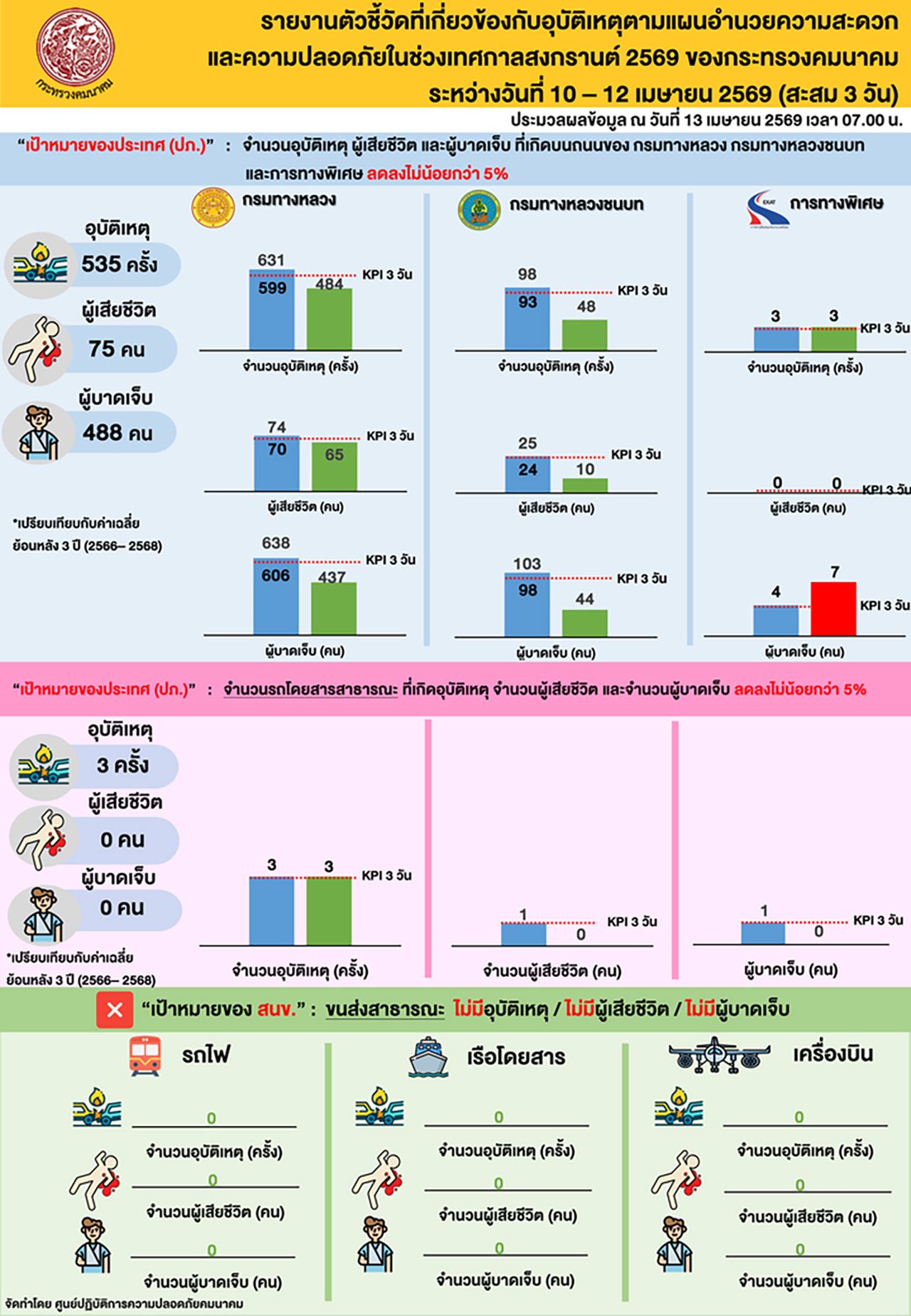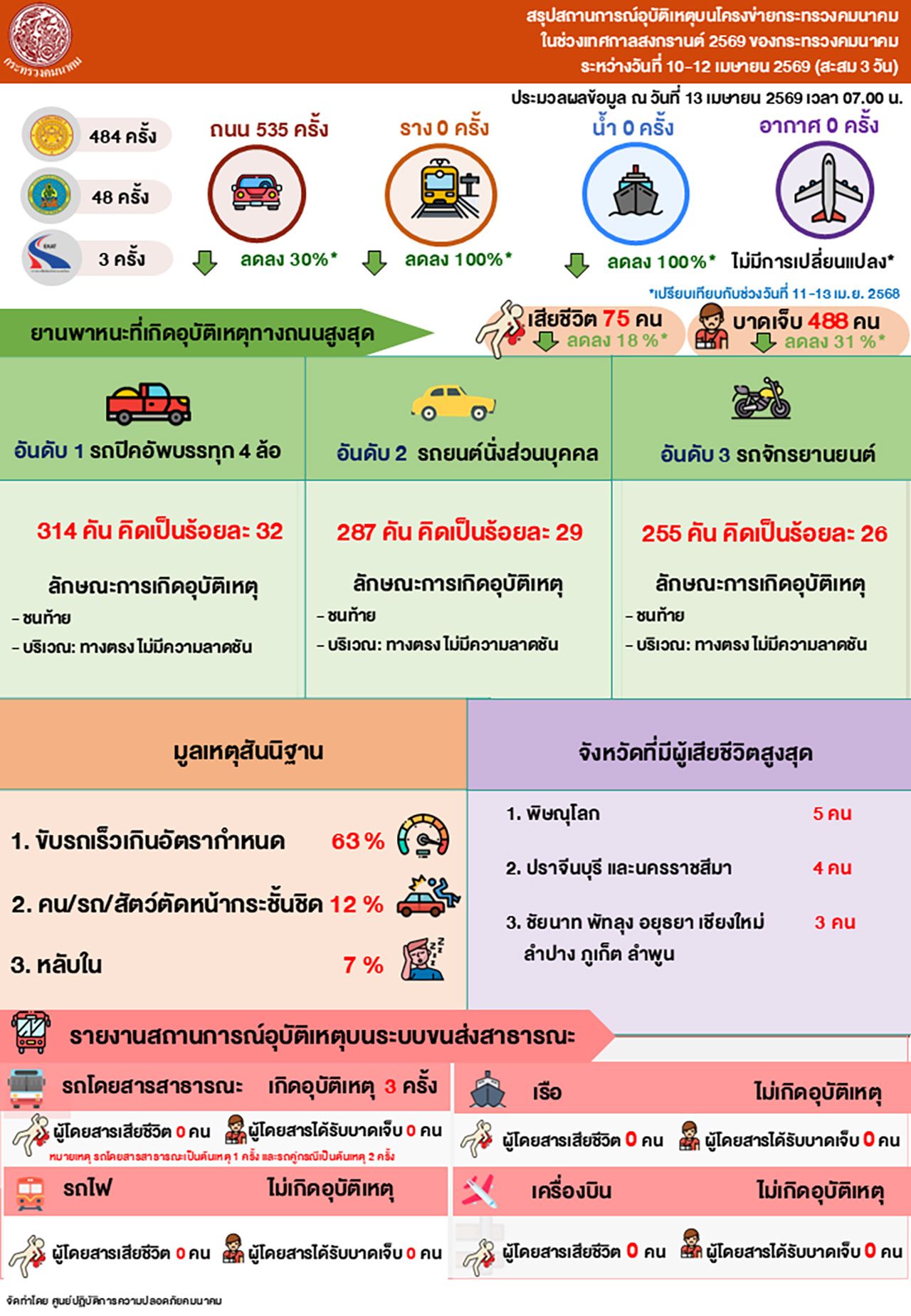 สถิติอุบัติเหตุ “คมนาคม” สรุป 3 วันสงกรานต์ 2569: ลดลงแต่ขับเร็วยังอันตราย