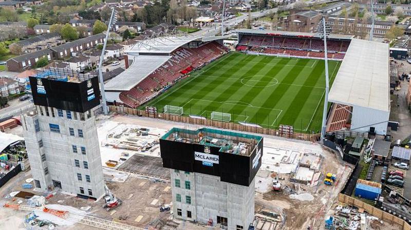 เจ้าของฮอลลีวูดตั้งเป้าระยะยาวขยายสนามถึง 55,000 ที่นั่ง โคปเทอร์เรซเดิมปิด 2007 ถล่ม 2023 เริ่มสร้างใหม่ 7,500-7,750 ที่นั่ง ธ.ค. 2025 เปิดไม่ทันพรีเมียร์ 2026 แต่เล็งเม.ย. 2027