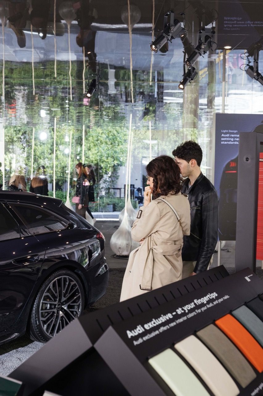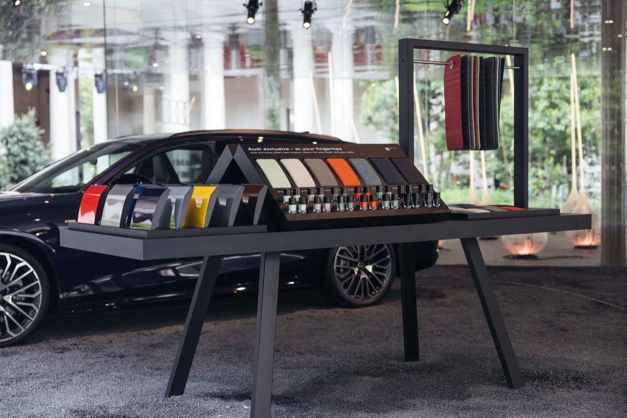 ผู้เข้าชมงานออกแบบสามารถเยี่ยมชม “Material Bar” ซึ่งจัดแสดงนิทรรศการที่ออกแบบเป็นพิเศษ เช่น เบาะนั่งสามที่นั่งที่ตกแต่งด้วยหนังสีต่างๆ และตะเข็บที่ตัดกัน นำเสนอภาพรวมของสินค้าหลากหลายรุ่นที่นำเสนอโดย Audi Exclusive