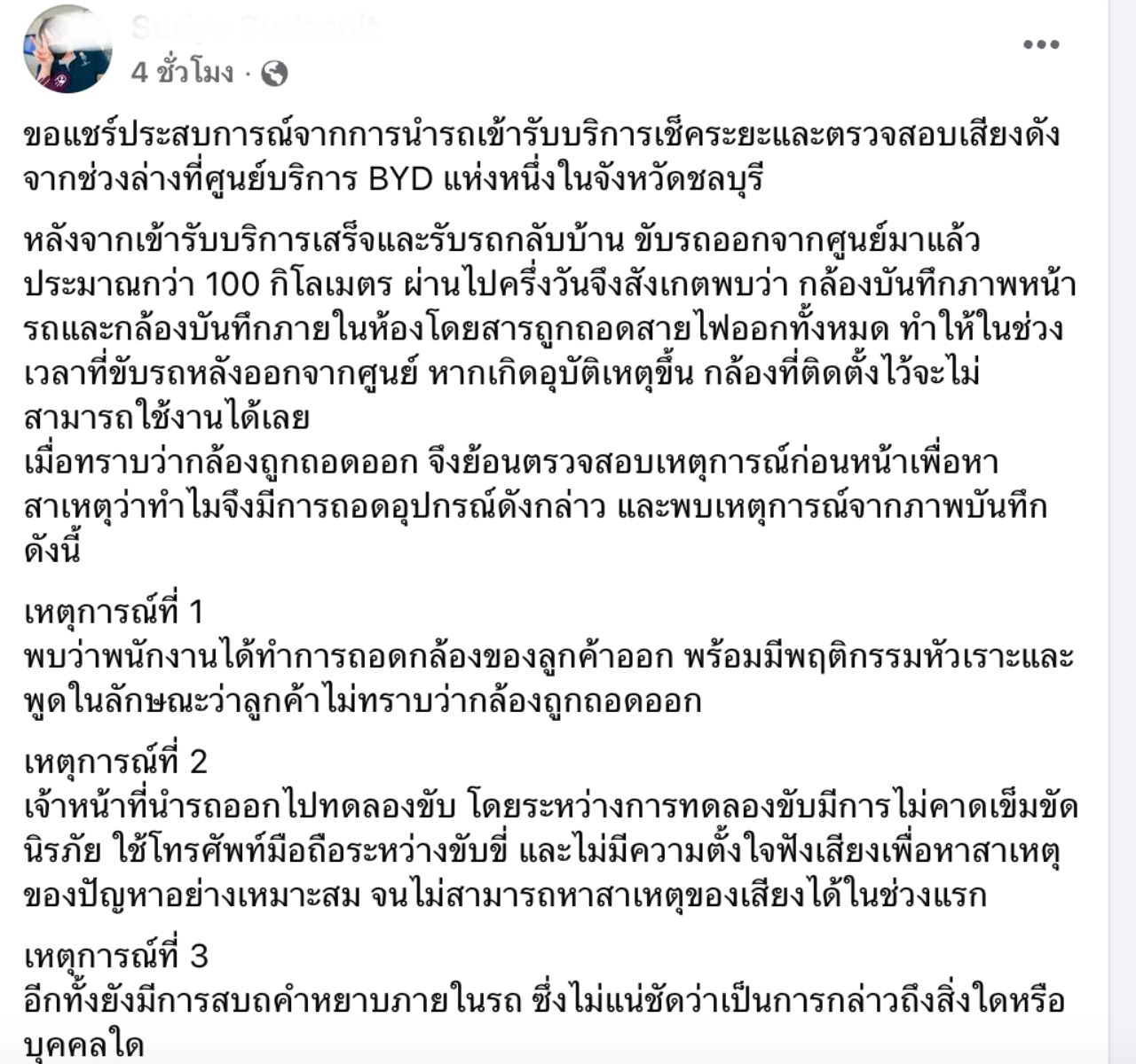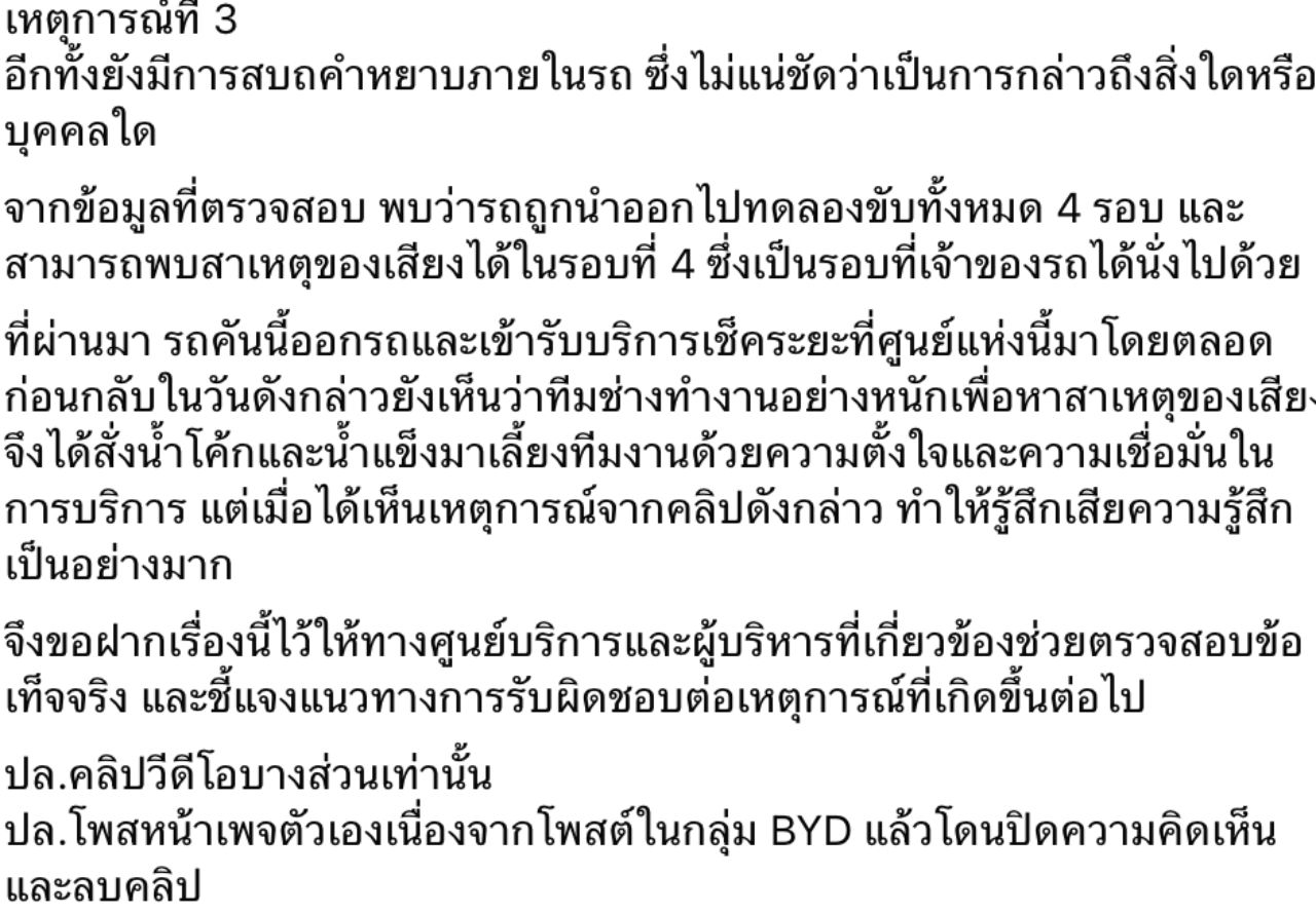เหตุการณ์นี้เกิดขึ้นเมื่อวันที่ 30 เมษายน 2569 มีผู้ใช้โซเชียลแชร์คลิปจากลูกค้าที่นำรถ BYD เข้าศูนย์บริการ โดยในคลิป ช่างซ่อมพูดถึงการดึงสายกล้องหน้ารถออก และมีคำพูดที่ไม่เหมาะสม ไม่เป็นผลดีต่อภาพลักษณ์ของบริษัท คลิปนี้ถูกแชร์กระจายไปทั่วแฟนเพจใหญ่ ๆ สร้างความฮือฮาและเสียงวิจารณ์อย่างหนัก